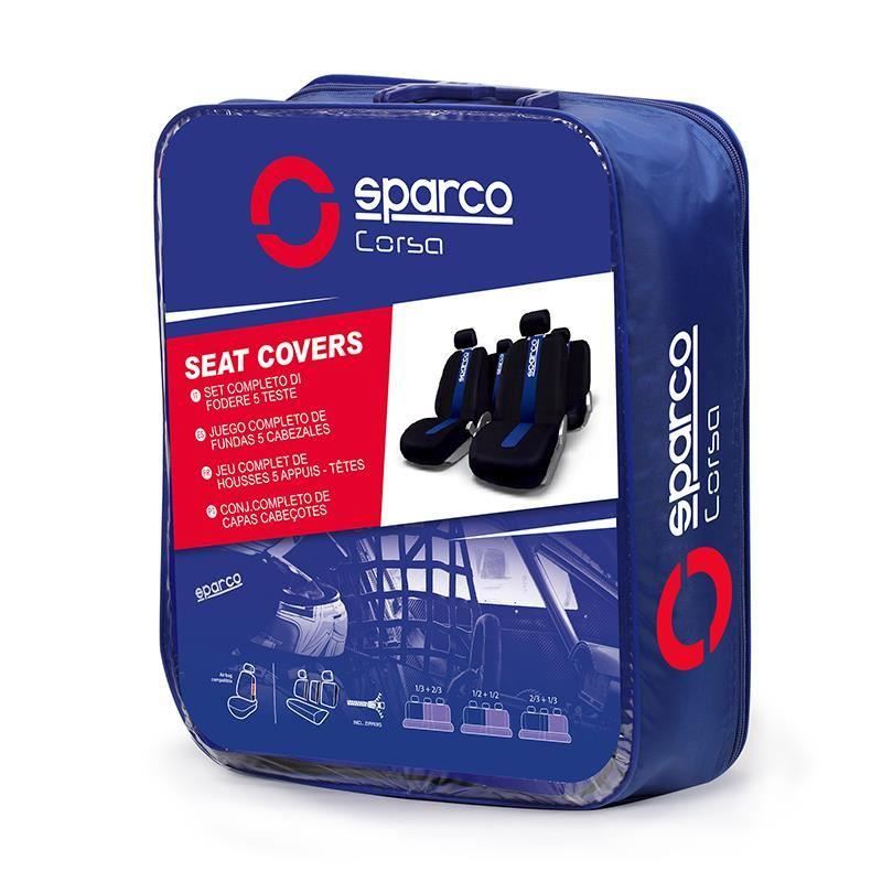 Предните и задните калъфи са със синя повърхност на която е изписано името на марката SPARCO; Задният калъф за облегалка е с цип; позволява използването на задния подлакътник;
