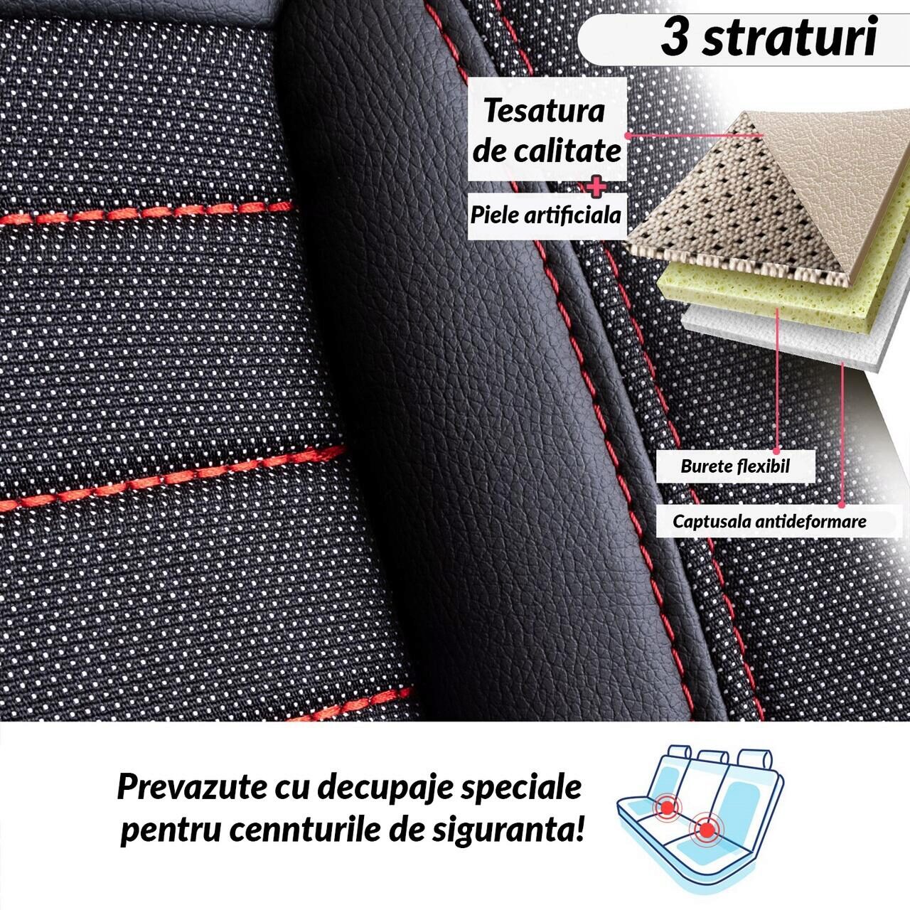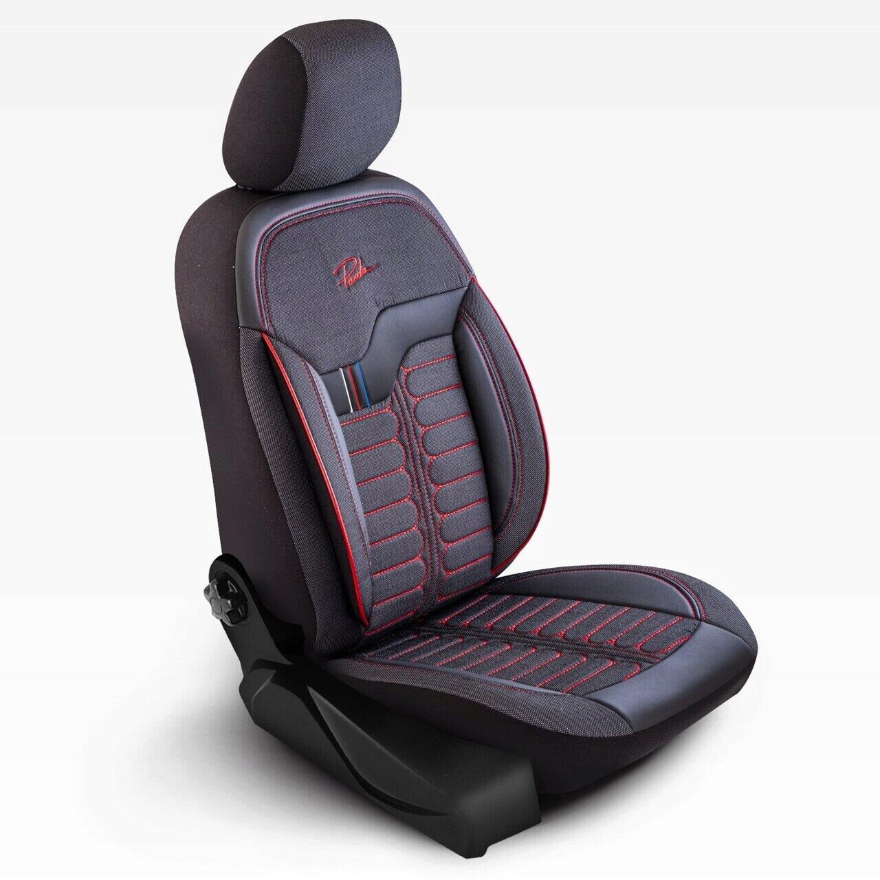 Комплект калъфи за седалки Panda London, разделяне на заднаата седалка, черни с червени шевове, 11 части